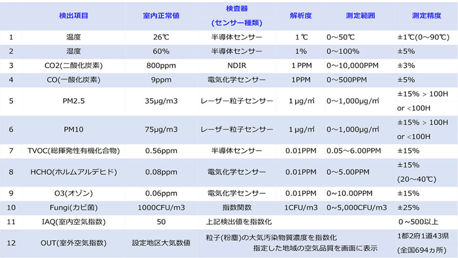 温度、湿度、PM2.5、PM10、二酸化炭素、一酸化炭素、ホルムアルデヒド、カビ、TVOC(総揮発性有機化合物)、オゾン、IAQ(室内複合指数)、OUT(室外複合指数)
