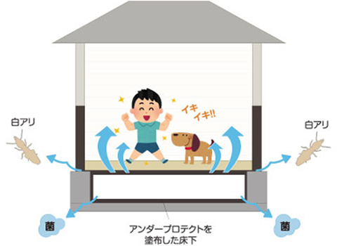 薬を使用せず自然素材で、床下のシロアリ、防腐対策ができたら・・・そんな思いで開発された木炭などの自然素材を配合した防蟻・防腐塗料が『Sumi Under Protect 』(アンダープロテクト)。自然素材でありながら、公的機関で証明されたシロアリ防蟻・防腐効果で床下と、住まい手を守ります。