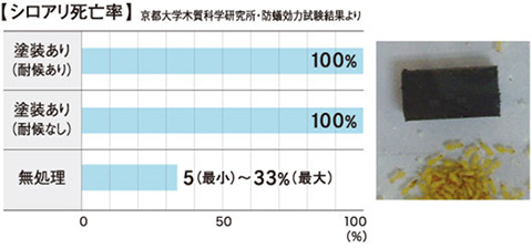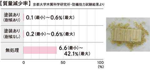 アンダープロテクトを塗装した試験体は、重量減少率が3%未満でシロアリに対する耐性があるとともに、死虫率が100%で、アンダープロテクトを処理した試験体はシロアリに耐性があることを確認できます。