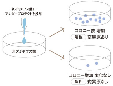 突然変異を引き起す性質を変異原性といい、この性質を検出する方法を変異原性試験といいます。アンダープロテクトはネズミチフス菌を用いたエームス試験(細菌を用いる変異原性試験)で発がん性などの遺伝子の損傷の有無を調べています。